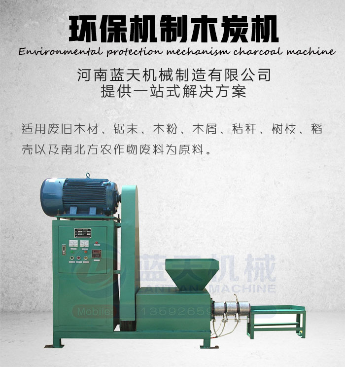 環(huán)保機制木炭機是以廢舊木材、鋸末、木粉、木屑、秸稈、樹枝、稻殼以及南北方農(nóng)作物廢料為原料,粉碎后經(jīng)環(huán)保機制木炭機高溫、高壓塑化后成型為機制木炭半成品,后經(jīng)炭化即為環(huán)保木炭。河南藍天機械制造有限公司是專業(yè)生產(chǎn)環(huán)保機制木炭機設(shè)備的廠家,咨詢環(huán)保機制木炭機價格請撥打官網(wǎng)熱線了解更多!環(huán)保機制木炭機是用木材的邊角廢料、樹枝、花生殼、玉米桿、桔桿等南北方農(nóng)作物廢料為原料做木炭等于垃圾換成錢,變廢為寶。在隔絕空氣條件下,經(jīng)高溫高壓機制炭成型機成型、炭化處理后制成的一種廢物再利用的能源,是變污染物為生物資源、發(fā)展農(nóng)業(yè)循環(huán)經(jīng)濟的重要模式。市場價在1.4元/公斤左右,適合用于工業(yè)生產(chǎn)、餐飲業(yè)和居家取暖。